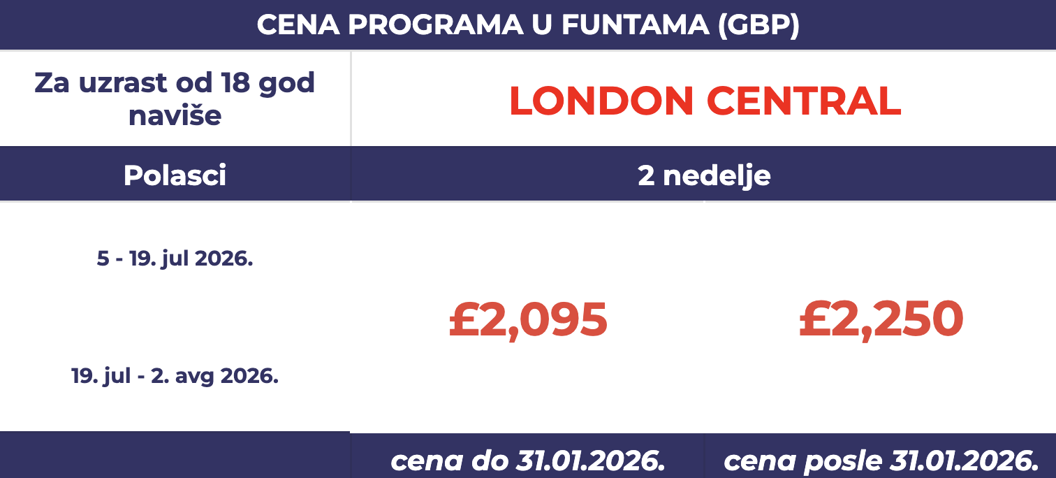 Sadržaj: radnim danima pre podne razgledanje znamenitosti Londona u svemu prema programu, posle podne pohađanje nastave u odabranom koledžu u Hajgejtu ili centralnom Londonu; subotom ekskurzije u Oksford i Greenwich, sve uključeno u cenu i bez skrivenih troškova.