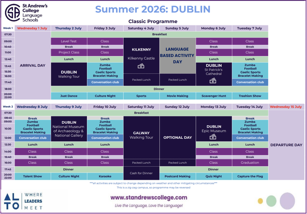 Kampus se nalazi u mirnom rezidencijalnom delu Dablina i nudi bezbedno i prijatno okruženje, sa velikim zelenim površinama, sportskim terenima i modernim sadržajima. Redovan gradski prevoz povezuje ga sa centrom Dablina, dok se svi izleti obavljaju privatnim autobusima.