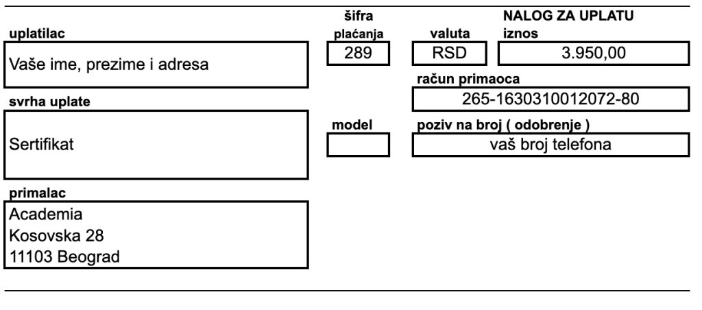 - Uplati troškove polaganja, izdavanja i slanja sertifikata u iznosu od 3.950 dinara na račun škole 265-1630310012072-80. Primalac je Academia, Kosovska 28, 11000 Beograd.